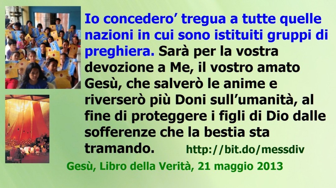 • 🔵 ➽IO CONCEDERÃ’' TREGUA A TUTTE QUELLE NAZIONI IN CUI SONO ISTITUITI GRUPPI DI PREGHIERA. SARÀ PER LA VOSTRA DEVOZIONE A ME, IL VOSTRO AMATO GESÙ, CHE SALVERÃ’ LE ANIME E RIVERSERÃ’ PIÙ DONI SULL'UMANITÀ, AL FINE DI PROTEGGERE I FIGLI DI DIO https://messaggidivinamisericordia.wordpress.com/2013/05/30/io-concedero-tregua-a-tutte-quelle-nazioni-in-cui/ ºººººº