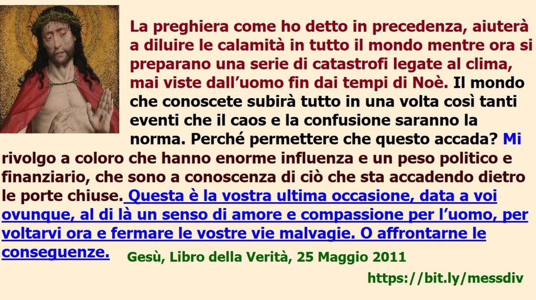 Mi rivolgo a coloro che hanno enorme influenza e un peso politico e finanziario, che sono a conoscenza di ciò che sta accadendo dietro le porte chiuse. Questa è la vostra ultima occasione, data a voi ovunque, al di là un senso di amore e compassione per l’uomo, per voltarvi ora e fermare le vostre vie malvagie. O affrontarne le conseguenze https://messaggidivinamisericordia.blogspot.com/2024/11/mi-rivolgo-coloro-che-hanno-enorme.html ººººº