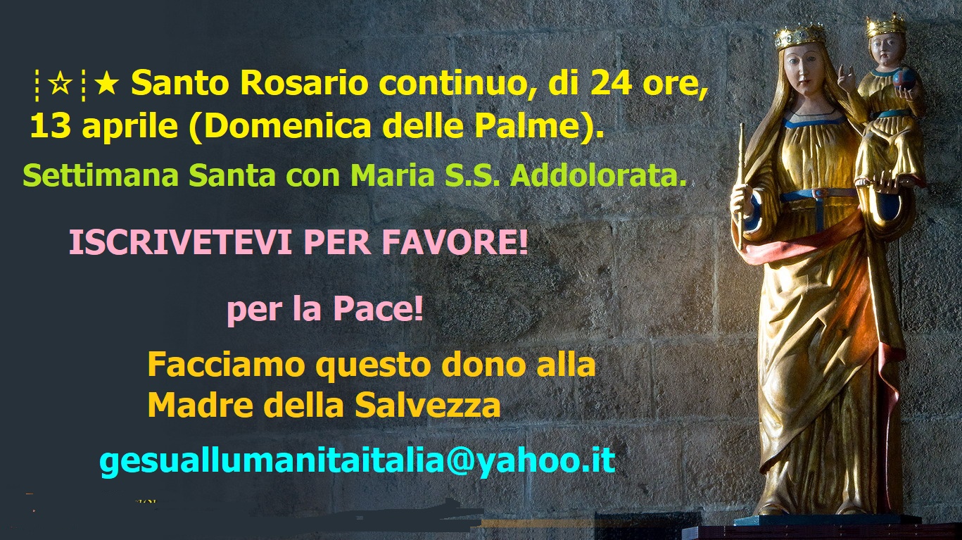 ┊☆┊★ Santo Rosario continuo, di 24 ore, 13 aprile (Domenica delle Palme), Settimana Santa con Maria S.S. Addolorata. ISCRIVETEVI PER FAVORE! https://messaggidivinamisericordia.blogspot.com/2025/04/santo-rosario-continuo-di-24-ore-13.html ºººº