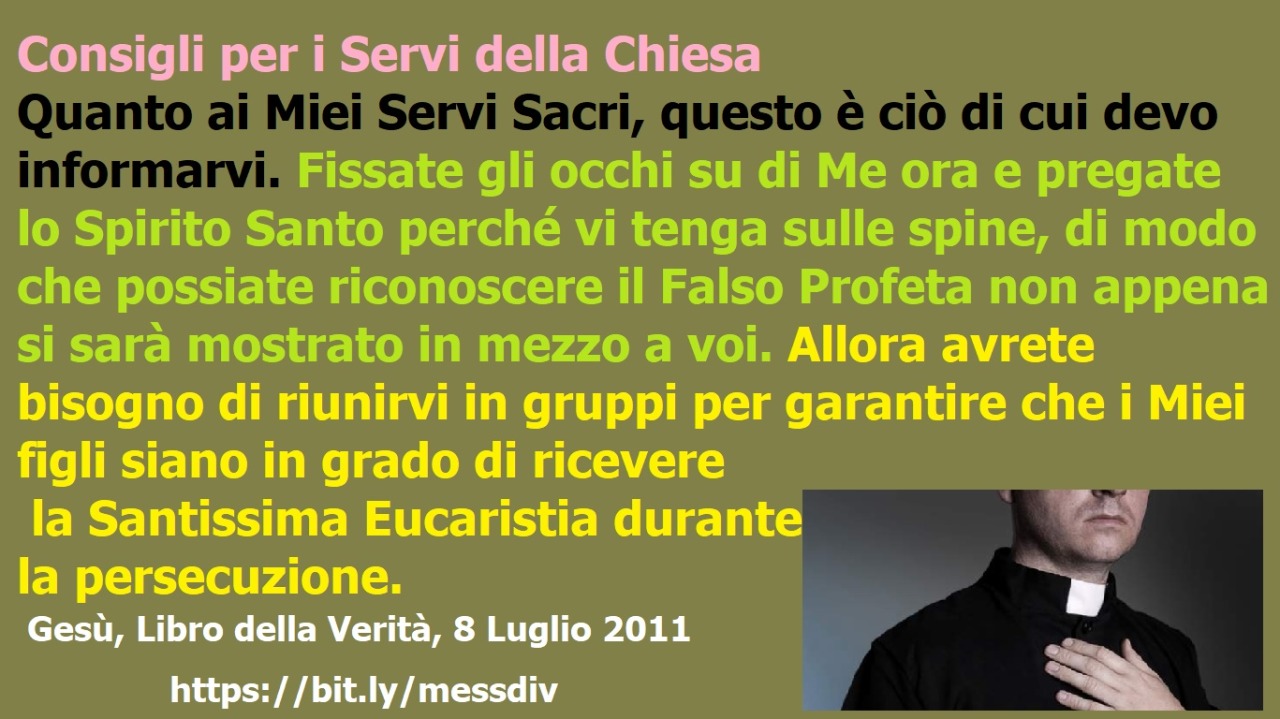 Consigli per i Servi della Chiesa Quanto ai Miei Servi Sacri, questo è ciò di cui devo informarvi. Fissate gli occhi su di Me ora e pregate lo Spirito Santo perché vi tenga sulle spine, di modo che possiate riconoscere il Falso Profeta non appena si sarà mostrato in mezzo a voi. Allora avrete bisogno di riunirvi in gruppi per garantire che i Miei figli siano in grado di ricevere la Santissima Eucaristia durante la persecuzione https://messaggidivinamisericordia.blogspot.com/2025/07/consigli-per-